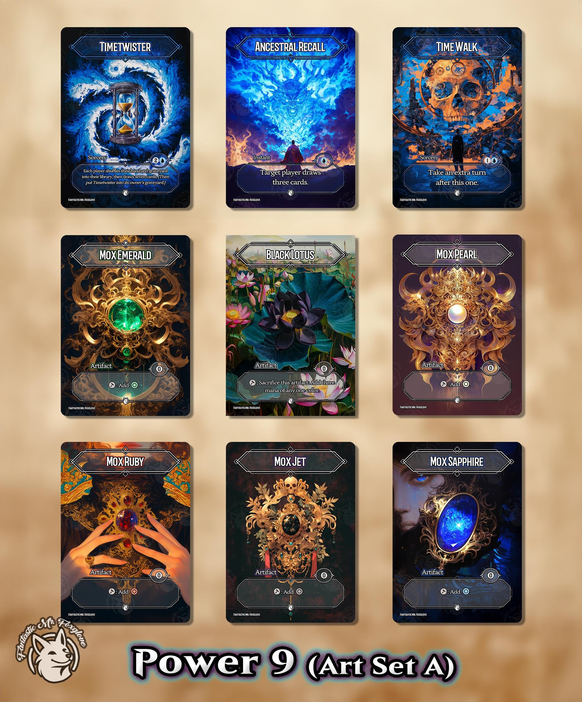 Black Lotus, Time Walk, Ancestral Recall, Timetwister, Mox Ruby, Mox Jet, Mox Pearl, Mox Emerald, Mox Sapphire