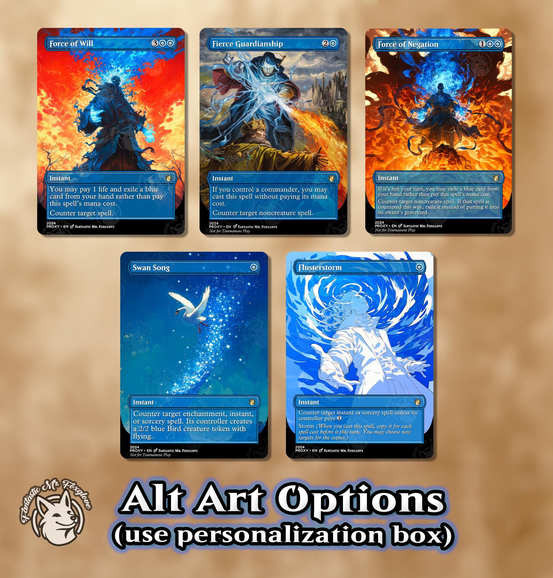 3+ Blue Counters | Proxy Cards — Force, Fierce, Mana Drain, Option to Add Swan Song, Pact, Force of Negation, Counterspell, Mindbreak, More!