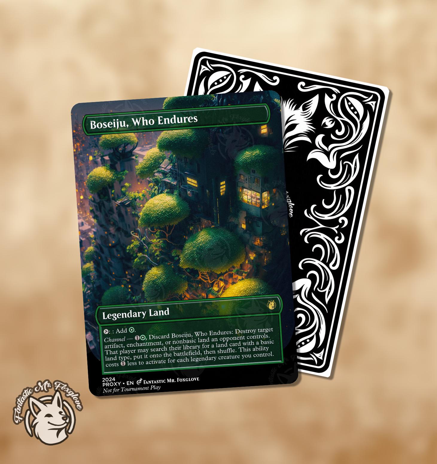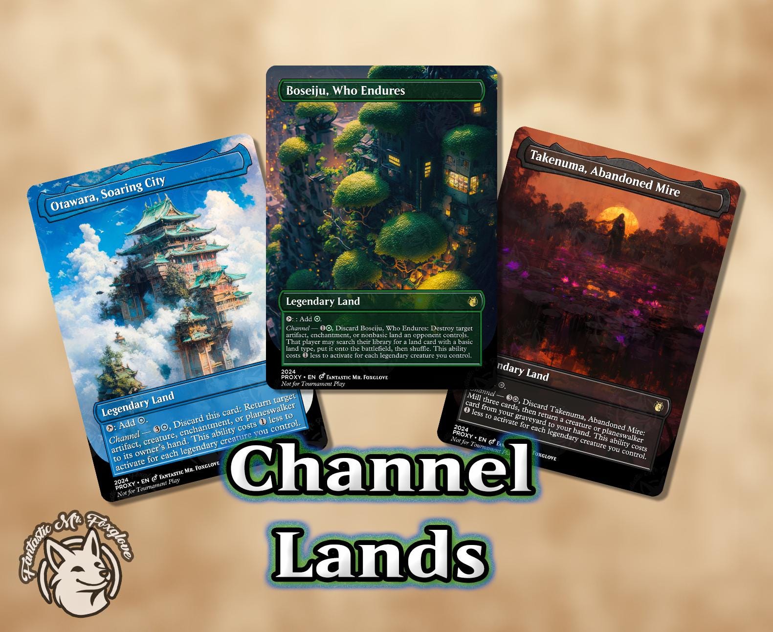 3 Channel Lands | Proxy Cards — Otawara Soaring City, Boseiju Who Endures & Takenuma Abandoned Mire