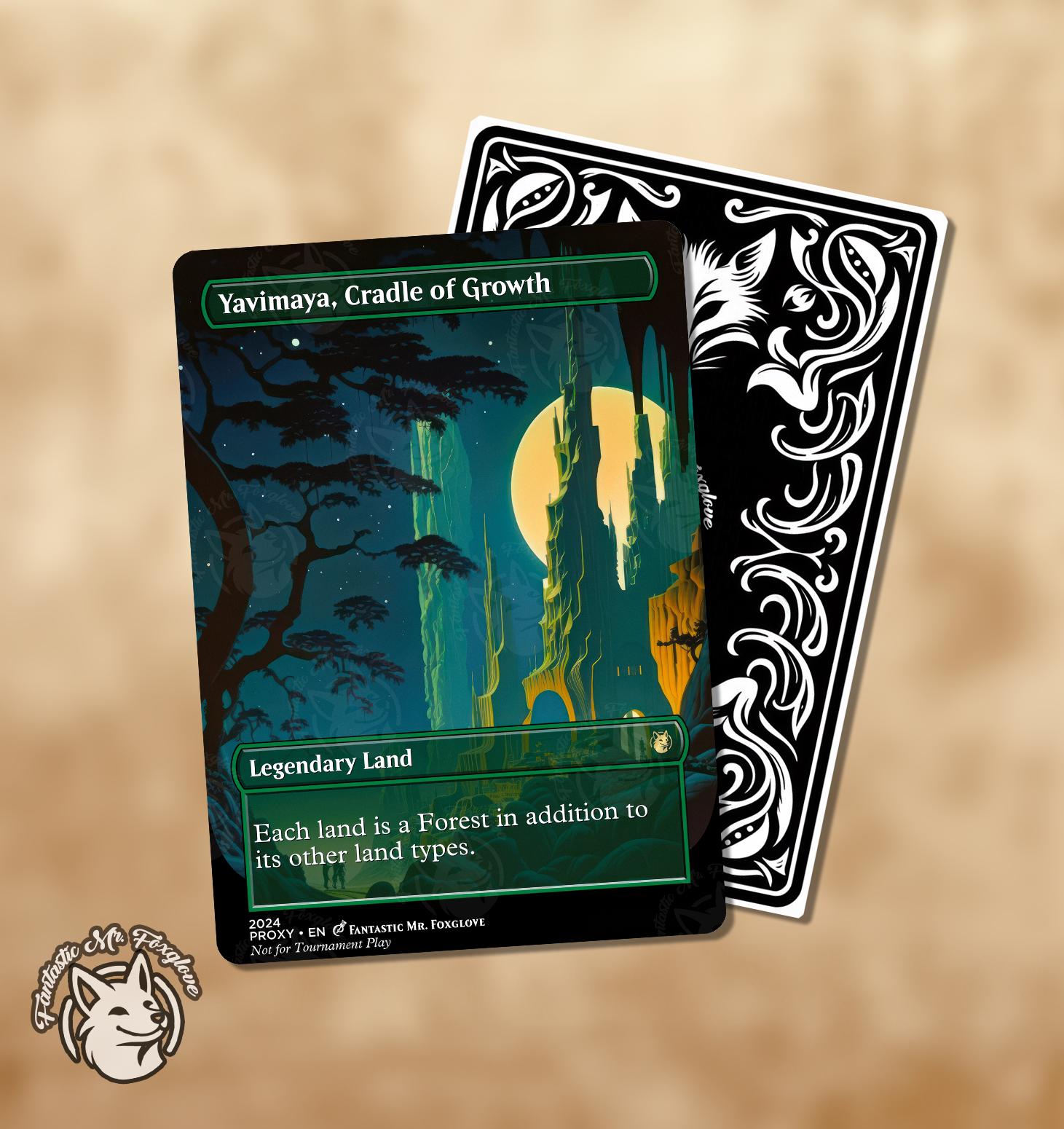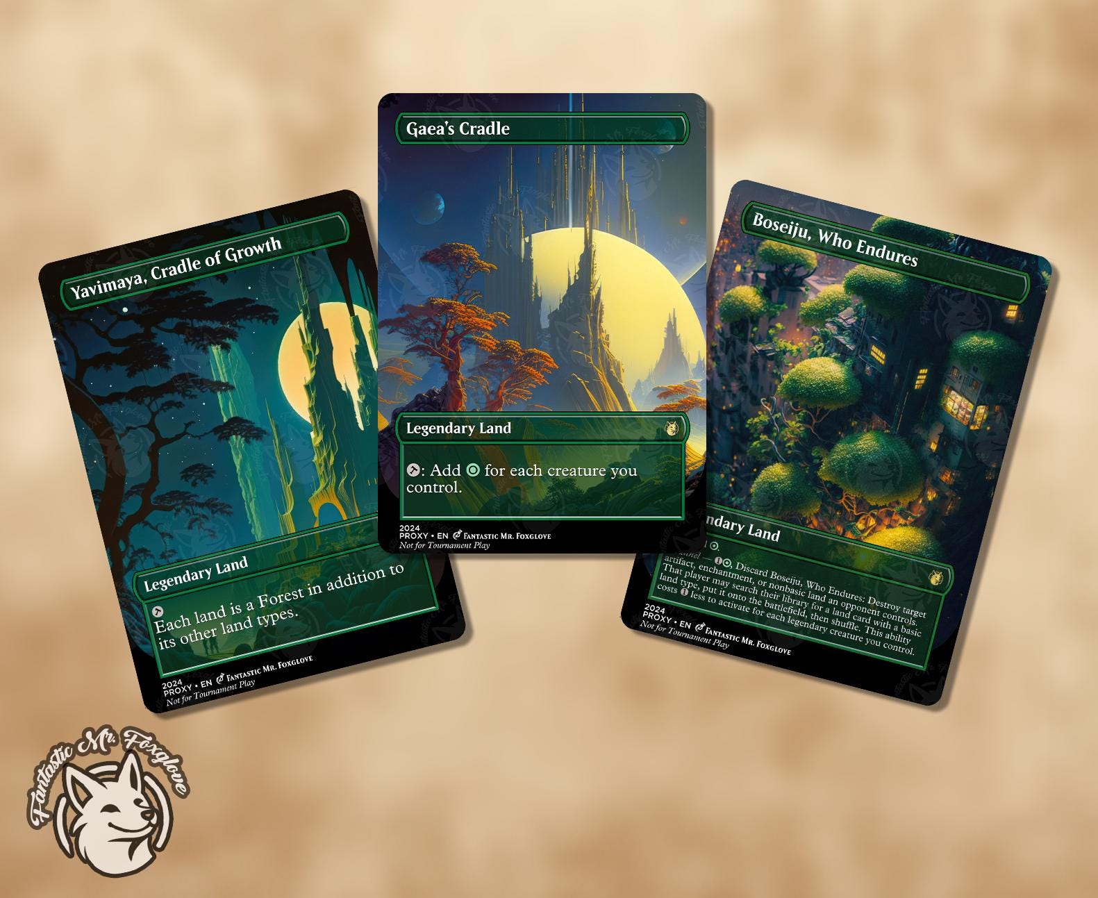 3 Green Lands | Proxy Cards — Gaea's Cradle, Boseiju Who Endures & Yavimaya Cradle of Growth