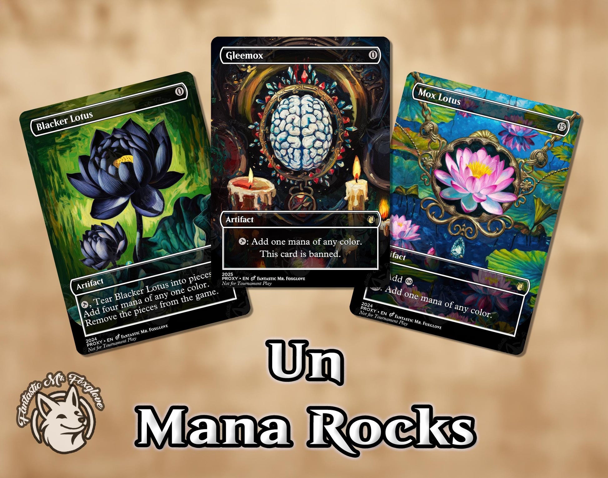 3 Un Mana Rocks | Proxy Cards — Blacker Lotus, Gleemox, Mox Lotus