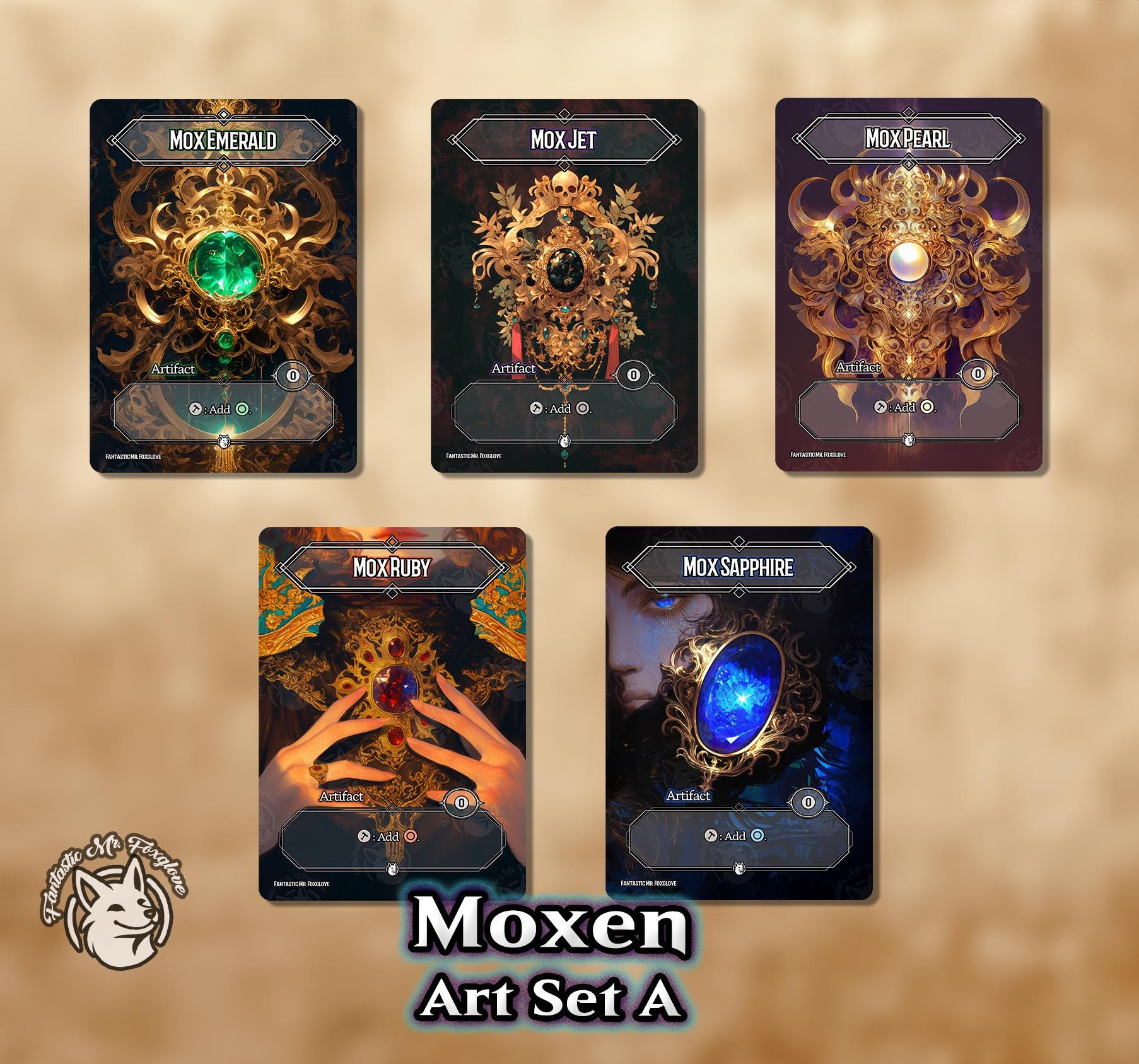 5 Moxen | Vintage Staple Proxy Cards — Mox Emerald, Jet, Sapphire, Ruby and Pearl of the Power 9 — Choose Your Art and Card Frame!