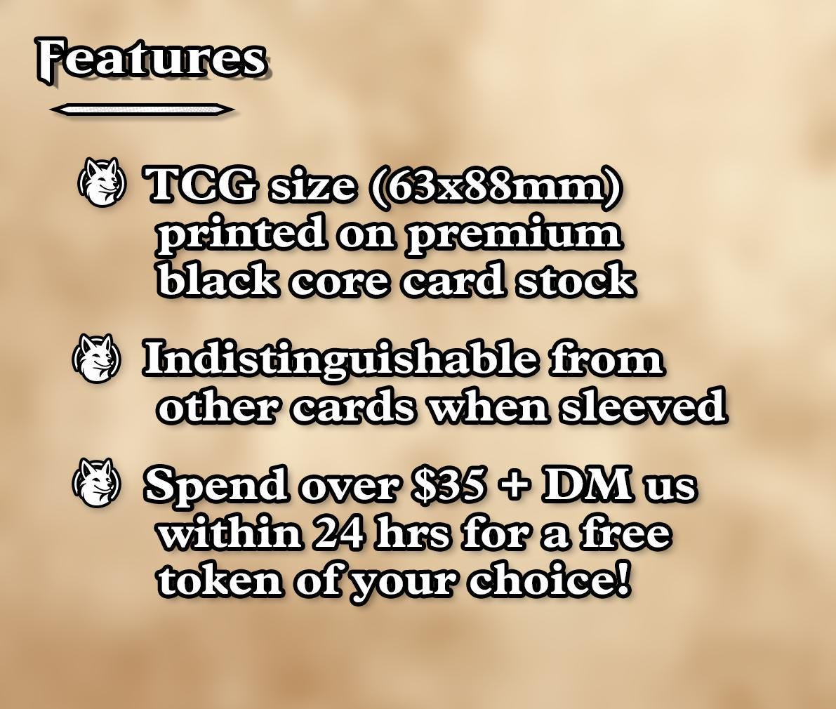 Our proxies are great for casual play, but are not official TCG products nor are they legal for sanctioned or tournament play, nor we do have any affiliation with the creators of any official TCGs.
