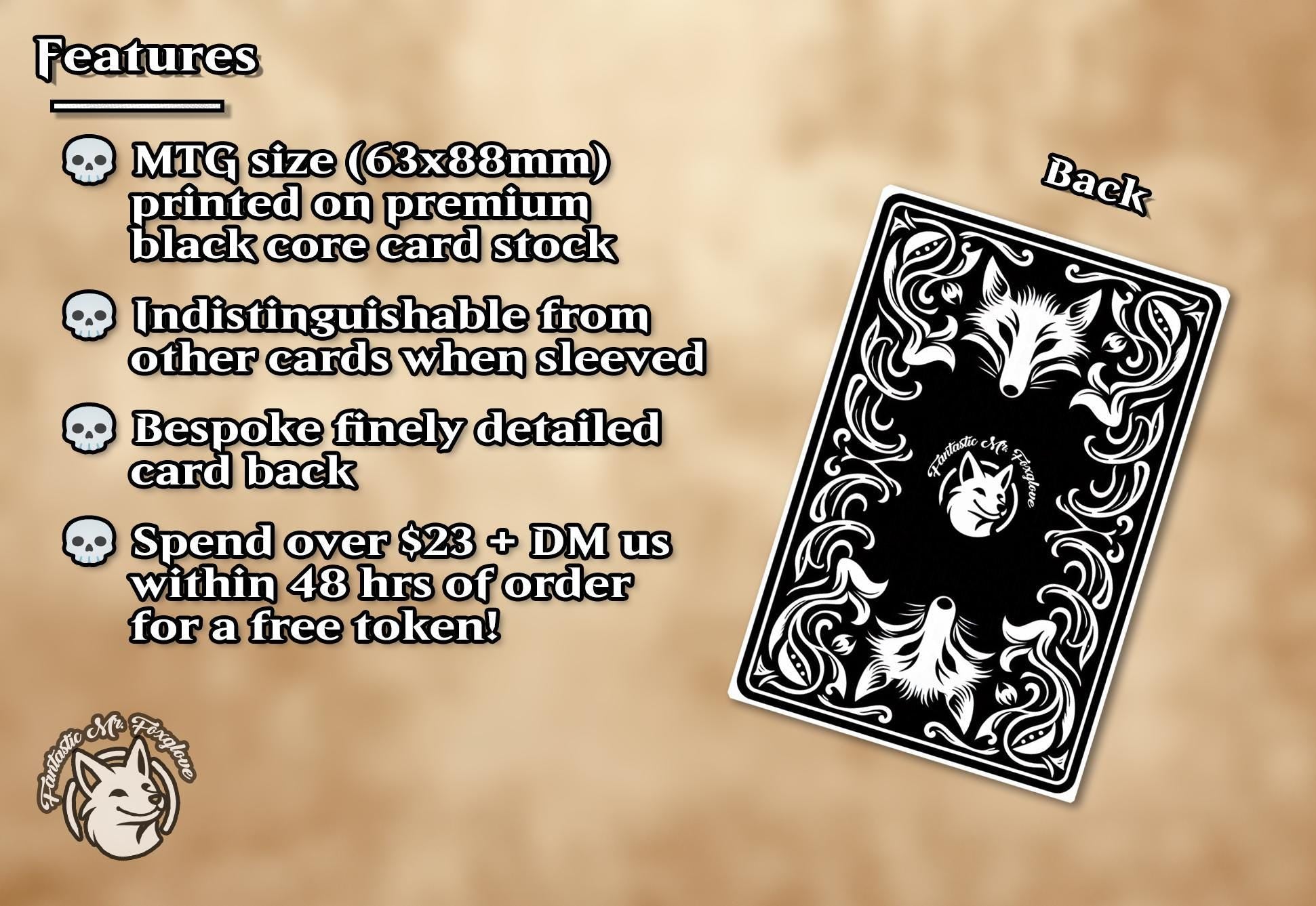 Our proxies are great for casual play like cube draft, but are not official TCG products nor are they legal for sanctioned or tournament play, nor we do have any affiliation with the creators of any official TCGs.