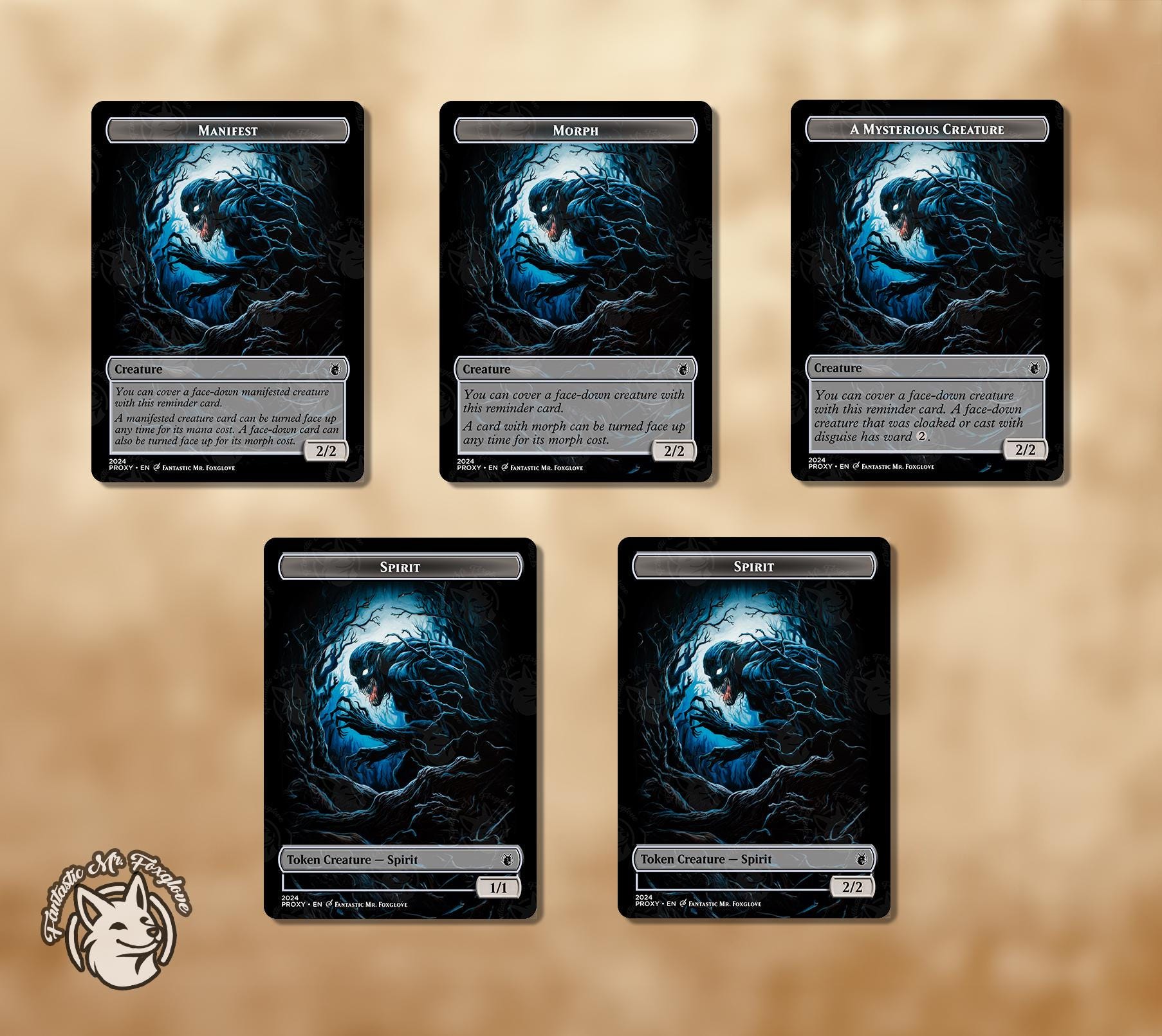 Perfect for all those eerie manifest dread cards! Also works great as a morph or disguised (AKA "A Mysterious Creature") or spirit token for something like Forbidden Orchard, Sokenzan or Ugin the Ineffable.